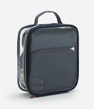 Necessaire unissex em PU. O kit inclui três peças: uma necessaire grande em PVC transparente com alça, uma média retangular com zíper metálico e uma menor texturizada.