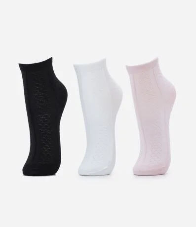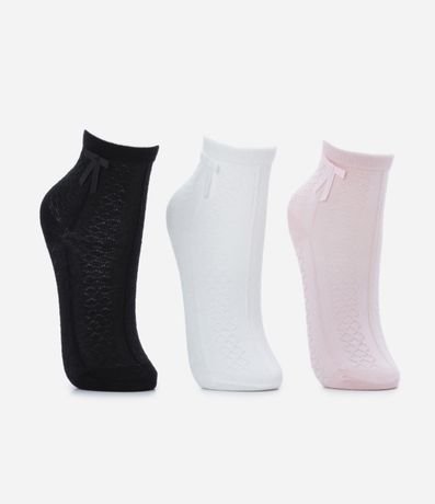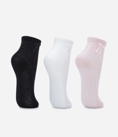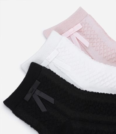 Ref: Kit com 03 pares de meia cano médio em algodão, com texturas e aplicação de lacinho.