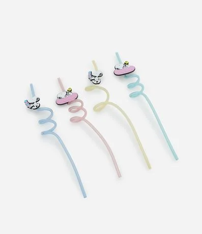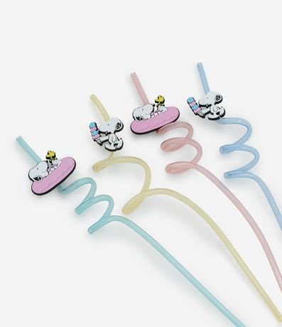 Kit com quatro canudos reutilizáveis de plástico em forma espiral. Cada canudo tem um patch do personagem Snoopy.