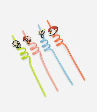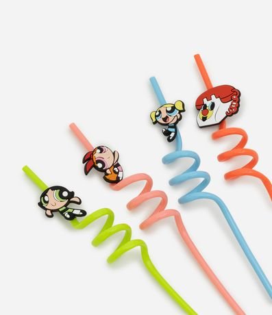 Ki com quatro unidades de canudos coloridos e reutilizaveis. Cada um tem um patch de uma personagem das Meninas Superpoderosas.