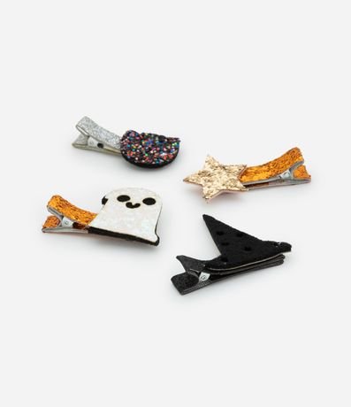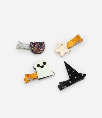 Ref: Kit com quatro presilhas de cabelo temáticas dia das bruxas: fantasminha, chapéu de bruxa, gatinho e estrela, com acabamento em glitter.