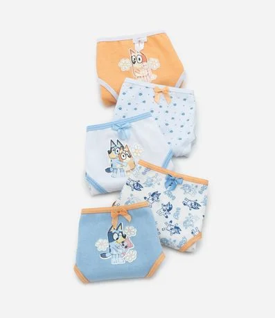 Kit com cinco calcinhas infantis confeccionadas em algodão certificado BCI e boas práticas ambientais. Modelos com cós elástico, lacinho aplicado e estampas divertidas da personagem Bluey, garantindo conforto e fofura para o dia a dia.