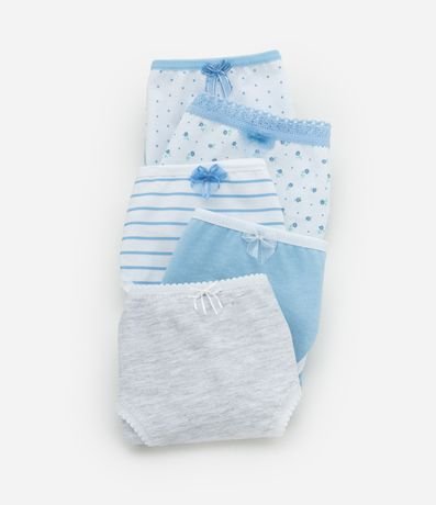 Kit com 05 calcinhas de modelo infantil, com cós elástico e confortável, lacinho aplicado e estampas variadas.