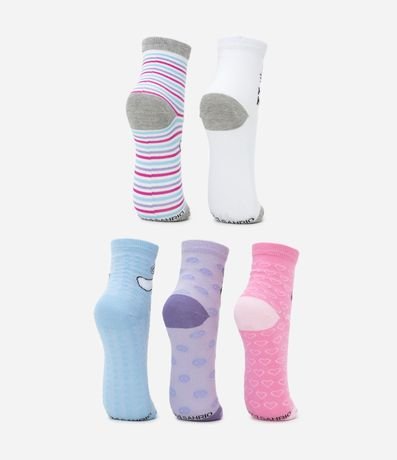 Ref: Kit de 05 meias infantis de canos médios confeccionados em maior parte em algodão mais sustentável com estampas fofinhas da Hello Kitty e amigos.