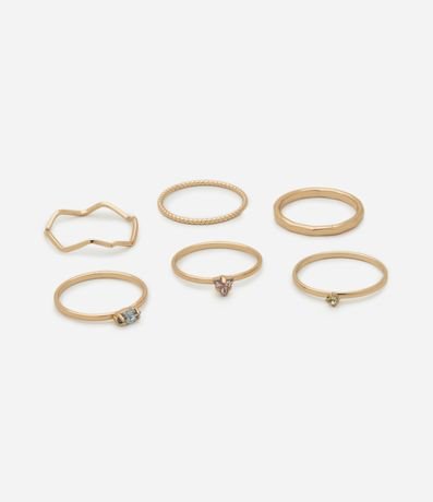 Kit de 06 anéis de metal com diferentes formatos delicados. Sendo 03 deles finos com detalhes de strass coloridos, 01 deles martelado, 01 com textura torcida e 01 modelo aliança.