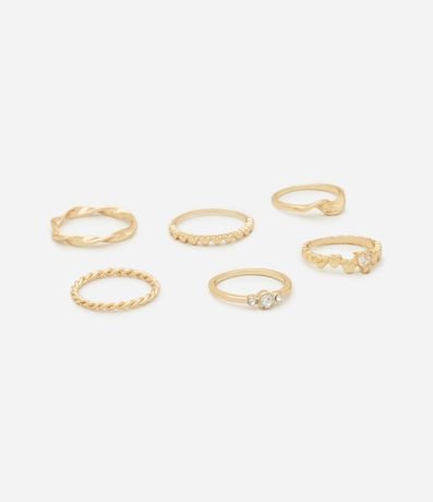 Ref: Kit com 06 anéis confeccionado em metal, delicados, possuem detalhes trançadinhos e com strass.