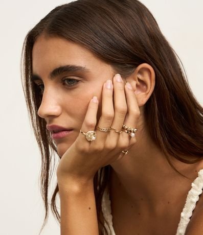 Ref: Kit com 6 anéis femininos em metal com banho light gold, texturas variadas e detalhes de pérola e concha. Perfeito para looks modernos e sofisticados.