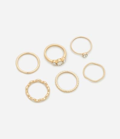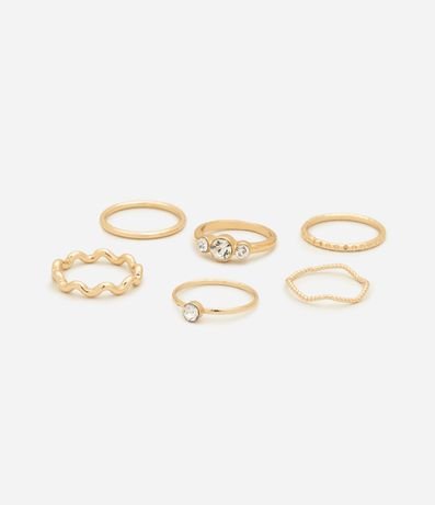 Ref: Kit feminino com 06 anéis em metal, incluindo modelo solitário com pedra central, versão com três pedras e quatro aros delicados e fininhos. Permitindo combinações versáteis e uso em diferentes dedos.