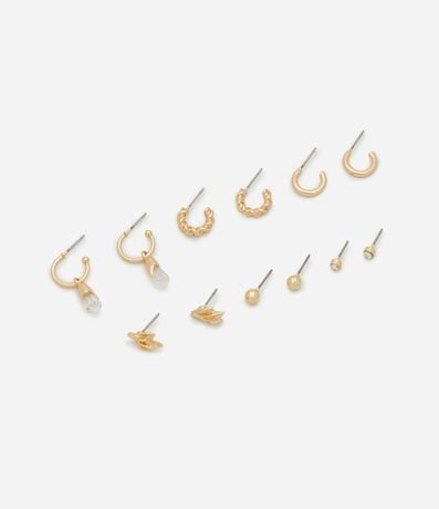 Ref: Kit com 6 brincos confeccionados com boas práticas ambientais. Modelos variados com banho light gold, incluindo argolas lisas, torcidas e com pingente cristal, garantindo elegância e versatilidade para compor looks modernos.