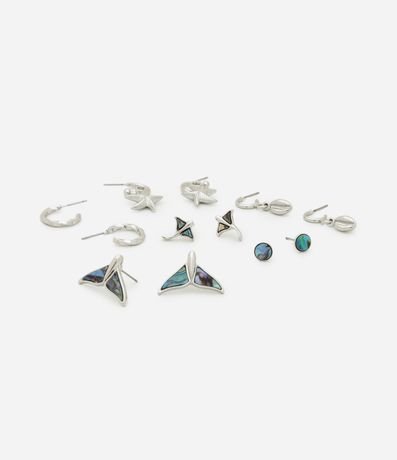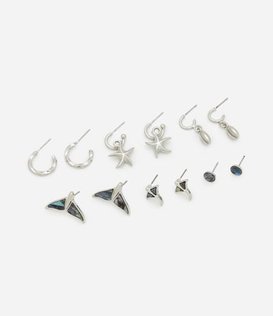 Ref: Kit com 06 brincos em metal, de modelos variados entre argola e botão, com pingentes que remetem ao fundo do mar com estrelas, conchas, cauda de sereia.