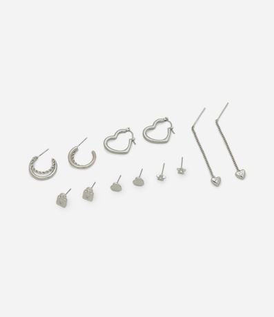 Kit de brincos com modelos variados, incluindo argolas, corações, pontos de luz e peças alongadas. Uma seleção versátil para compor diferentes looks, combinando delicadeza e estilo no dia a dia.