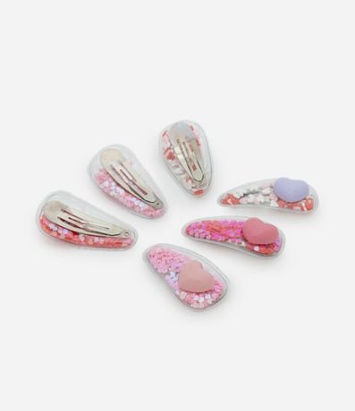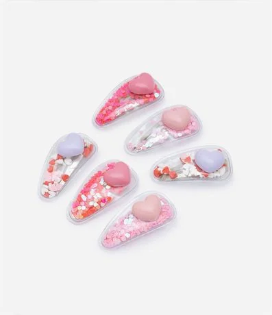 Ref: Kit com 06 presilhas de cabelo, em plástico, com coraçãozinho aplicado e brilhos coloridos.