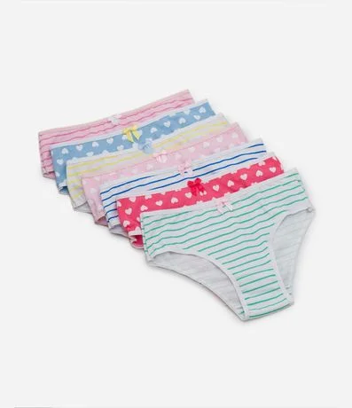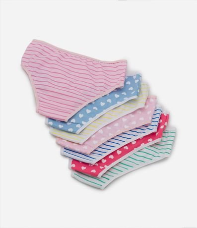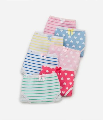 Ref: Kit com 07 calcinhas infantis, modelo biquini, com estampa de listras e corações. Possui lacinho frontal.