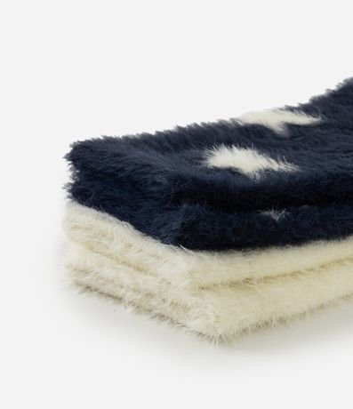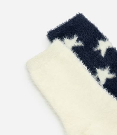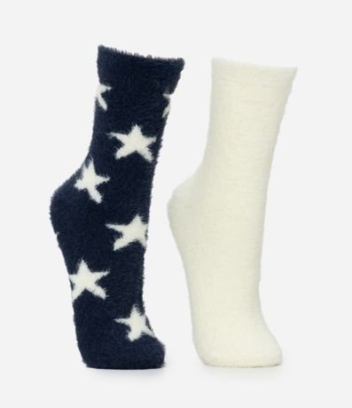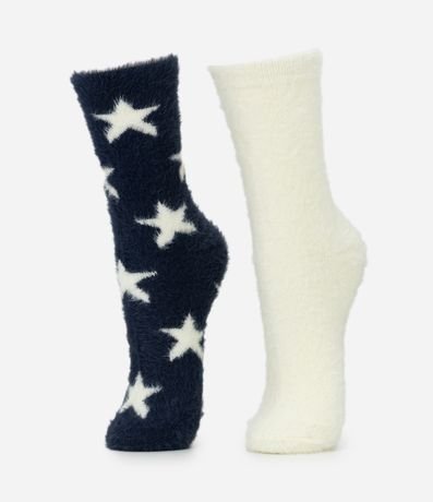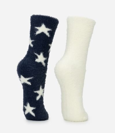 Ref: Kit com 2 pares de meias de cano alto, confeccionadas em poliamida com pelo artificial, proporcionando toque extremamente macio e conforto térmico para o uso em dias frios. O conjunto apresenta duas variações: um par com estampa de estrelas em fundo azul-marinho e outro liso em tom branco, ambos com acabamento felpudo em toda a peça. As meias possuem punho confortável que garante boa fixação sem apertar, sendo ideais para composições casuais de inverno e uso doméstico.