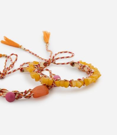 Ref: Kit com 2 pulseiras em poliamida: uma com cascalhos e outra com cordão, ambas com banho dourado.