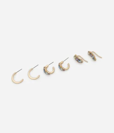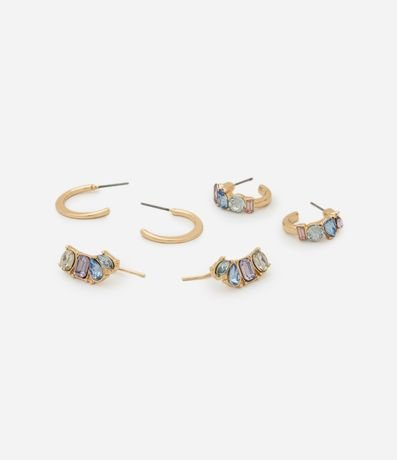 Ref: Kit com três argolas: strass, earjacket e lisa. Banho ouro light e metal reciclado. Versátil e moderno, ideal para compor looks cheios de estilo.