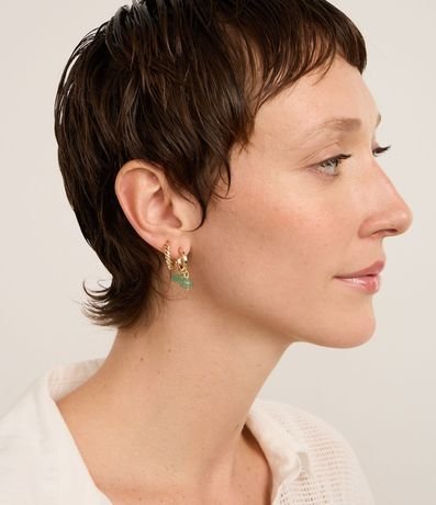 Kit com 3 brincos de argola em banho Light Gold: 1 torcida, 1 com fio de cascalho e 1 com pedra verde.