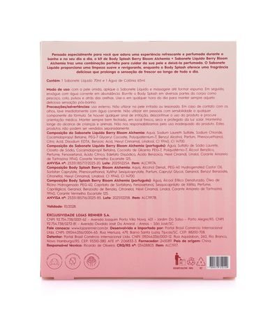 Composição Body Splash Berry Bloom Alchemia (português): Água, Álcool Etílico Denaturado, Óleo de Rícino Hidrogenado PEG-40, Caprilato de Sorbitano, Fenoxietanol, Sesquicaprilato de Xilitila, Perfume, Caprililglicol, Geraniol, Benzoato de Benzila, Citronelol, Hexil Cinamal, Linalol, Corante Amarelo de Tartrazina 19140, Corante Vermelho Escarlate 125.