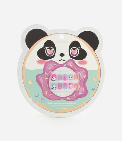 O kit contém 10 unhas postiças autoadesivas com estampas variadas, incluindo pandas, corações e espirais coloridas. Fácil de aplicar e perfeito para crianças ou adultos que querem decorar as unhas de forma rápida e sem complicações.