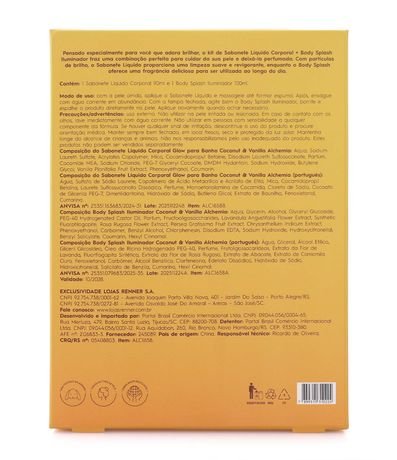 Composição Body Splash Iluminador Coconut & Vanilla Alchemia (português): Água, Glicerol, Álcool Etílico, Gliceril Glicosideo, Óleo de Rícino Hidrogenado PEG-40, Perfume, Frutoligossacarídeos, Extrato da Flor de Lavanda, Fluorflogopita Sintética, Extrato da Flor de Rosa Rugosa, Extrato de Abacate, Extrato de Camomila Ouro, Fenoxietanol, Carbômer, Álcool Benzílico, Clorfenesina, Edetato Dissódico, Hidróxido de Sódio,