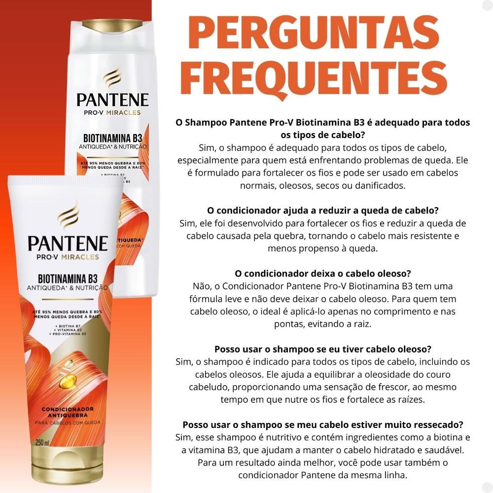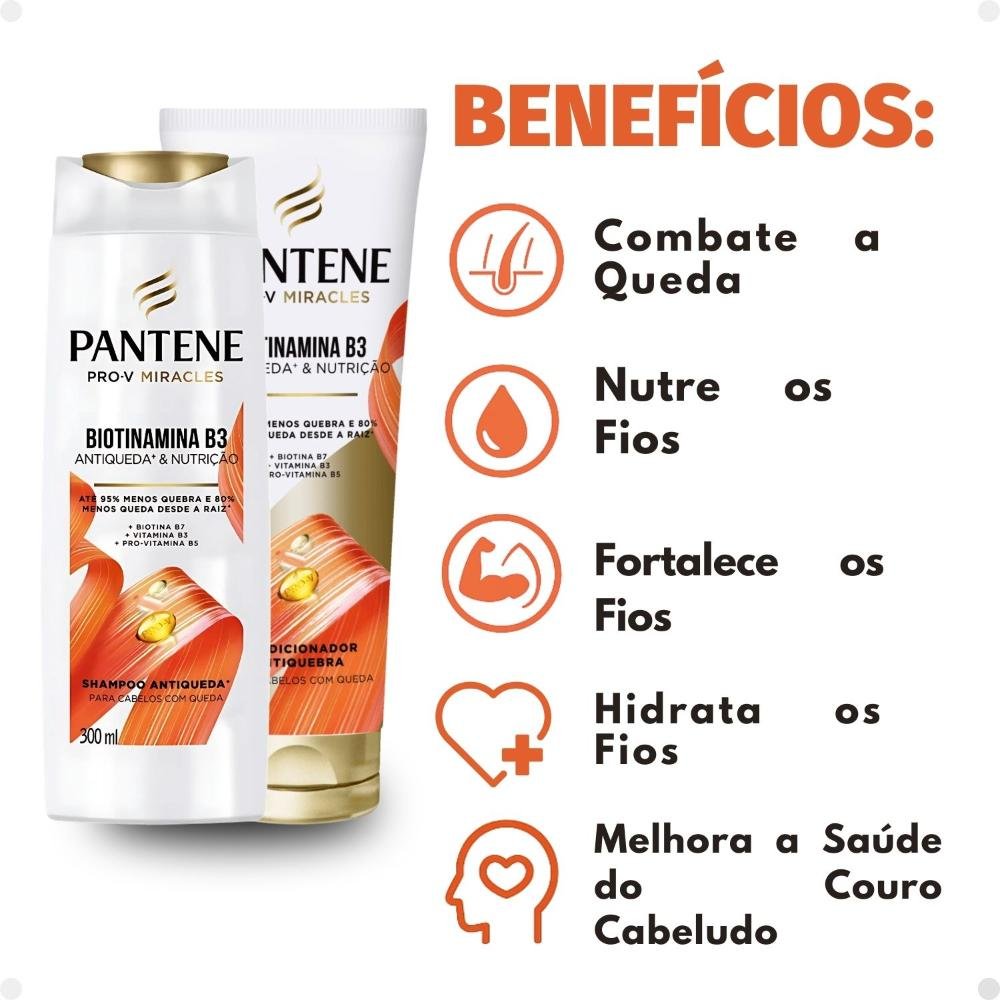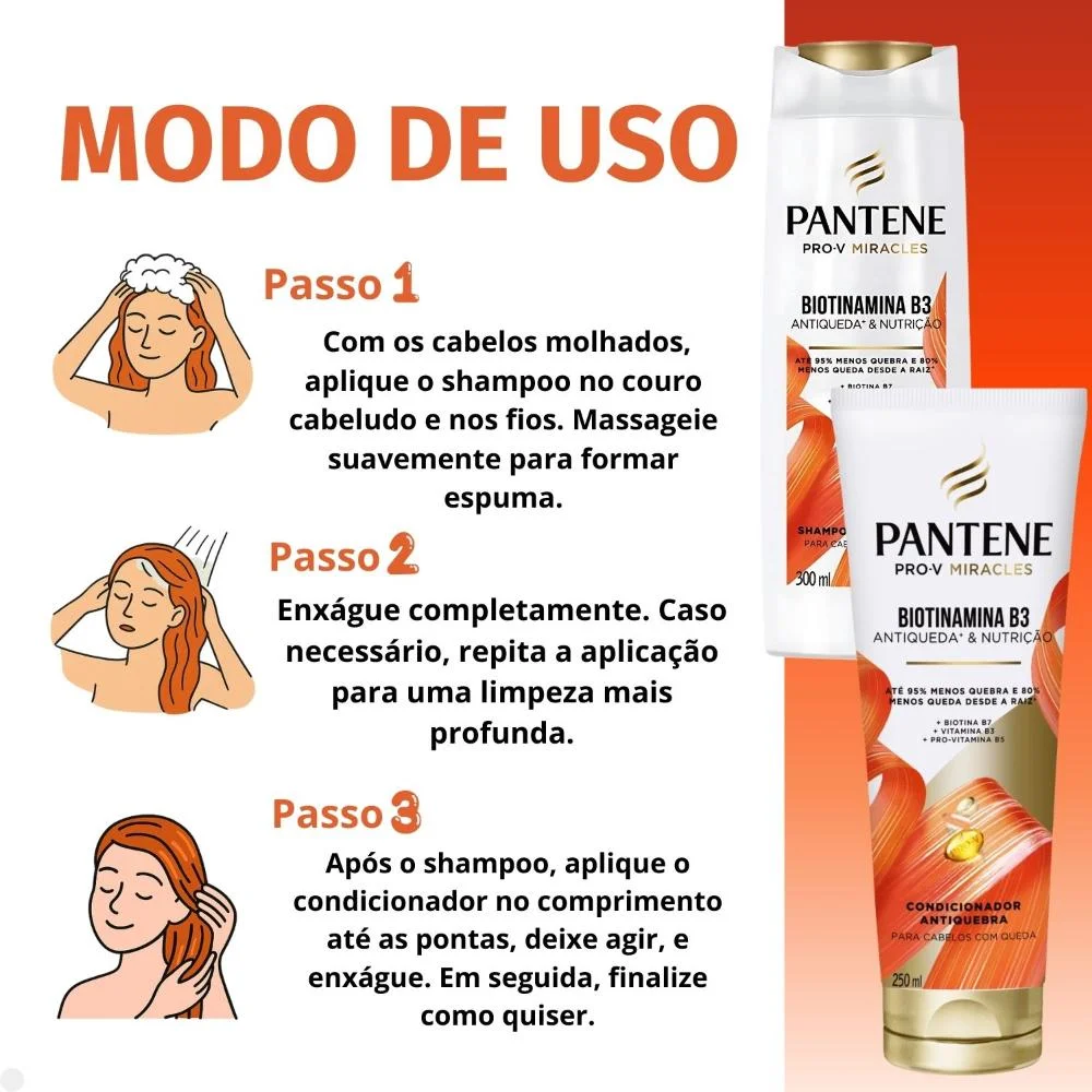 O Kit Pantene Biotinamina B3 Antiqueda e Nutrição: Shampoo 300ml e Condicionador 250ml é um kit de cuidados capilares que visa combater a queda de cabelo e nutrir os fios ao mesmo tempo. Formulado com a combinação de biotina e vitamina B3, dois ingredientes conhecidos por fortalecer e nutrir os cabelos, melhorando a saúde do couro cabeludo e a aparência dos fios. Ajuda a fortalecer os fios e reduzir a quebra, contribui para o crescimento saudável do cabelo. Ajuda no fortalecimento da raiz e na redução da queda de cabelo. Também oferece nutrição e hidratação aos fios, deixando-os macios e sedosos. Fórmula sem parabenos.