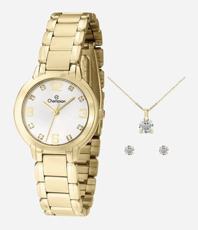 Ref: Relógio Feminino Analógico com Colar e Brinco, Pulseira em aço dourado, resistente à àgua para seu conforte e segurança.