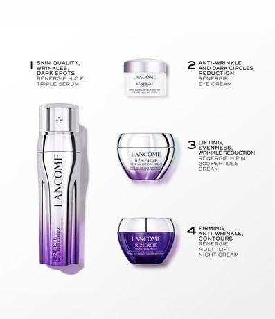 PASSO 1: Rénergie HCF Triple Serum 50ml Rénergie HCF Triple Serum é uma inovação revolucionária que marca uma nova era de cuidados com a pele de alto desempenho da Lancôme. Com sua embalagem exclusiva de três câmaras e combinação magistral de ingredientes, este revolucionário sérum antienvelhecimento atinge o equilíbrio perfeito entre ser altamente eficaz e, ao mesmo tempo, proporcionar uma experiência suave e cuidadosa para a pele. É o primeiro sérum de dose tripla desse tipo no mercado. A combinação especializada de ingredientes poderosos nesta fórmula, representada pelo nome HCF (ácido hialurônico, vitamina C + niacinamida e ácido ferúlico), foi projetada para fornecer benefícios antienvelhecimento ideais em uma dose tripla. Ele visa a melhora visível dos sinais de envelhecimento, camada por camada: