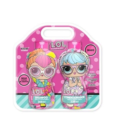 Com o Kit de Shampoo e condicionador suave da LOL as meninas vão amar porque estarão com seus cabelos limpos , hidratados e cheirosos e ainda podem brincar com a cartela de adesivos que vem no kit. Benefícios e efeitos : Manter cabelos limpos e brilhantes . Como usar : Shampoo- Aplicar uma pequena porção sobre as mãos esfregar sobre o couro cabeludo e enxaguar ,após a lavagem com o shampoo , fazer o mesmo processo com o condicionador porém massageando as pontas dos cabelos . Composição : 1 Shampoo 250ml + 1 condicionador 230ml + 1 cartela de adesivos. Produtos Hipoalergênico,sem Parabenos e Dermatologicamente testado.