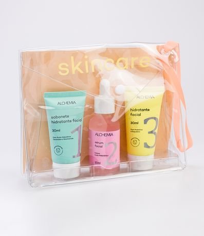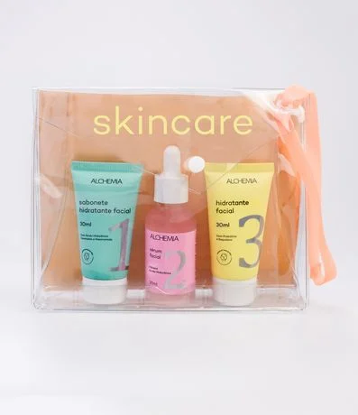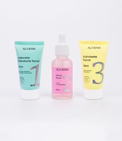 Contém: 1 Sabonete Hidratante Facial – Ceramidas, Ácido Hialurônico, Niacinamida - Alchemia 30ml, 1 Sérum Facial Alchemia 30ml, 1 Hidratante Facial - Probiótico e Esqualano - Alchemia 30ml, 1 nécessaire.