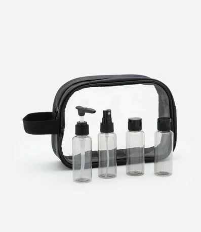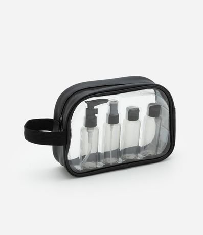Ref: Kit de viagem com nécessaire transparente, fechamento por zíper, alça lateral e frascos para produtos.
