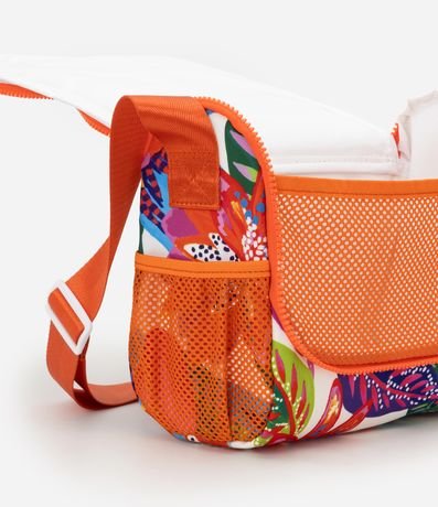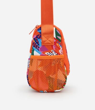 Ref: Lancheira com alça de mão, tampa com fechamento de zíper, divisórias internas, alça longa ajustável, bolso de telinha lateral e estampa floral com cajus.