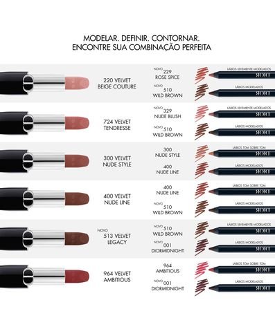 21 tonalidades que combinam perfeitamente com a paleta Rouge Dior, desde os vermelhos intensos 999 e 777 Fahrenheit, até as tonalidades rosadas como 720 Icone e aos tons nudes como o indispensável 100 Nude Look. A paleta Rouge Dior Contour é enriquecida com uma cor couture universal, 000 Diornatural, que se pode usar com toda a gama de tonalidades Rouge Dior.