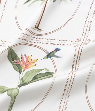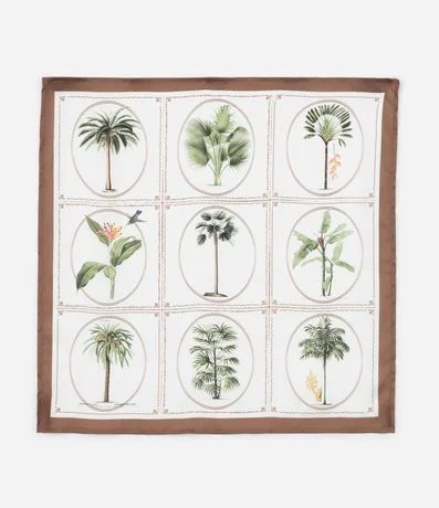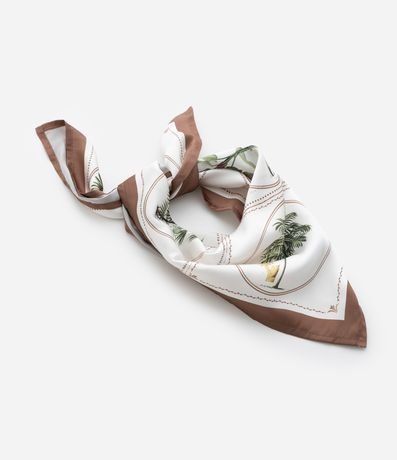 Ref: Lenço feminino acetinado com estampa botânica e viés contrastantes.