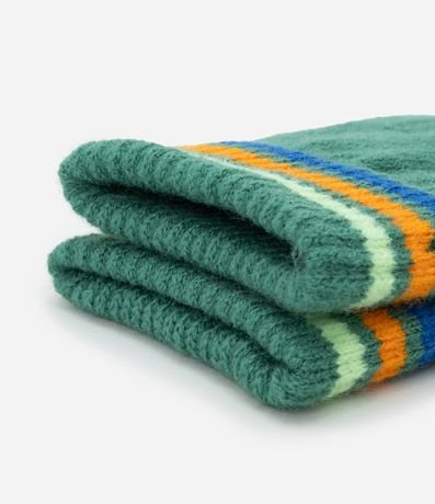 Luvinha infantil confeccionada em tricô quentinho, com estampa divertida de dinossauro e listras nos punhos.