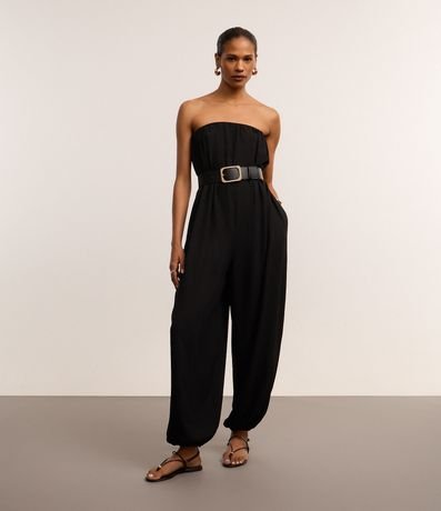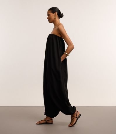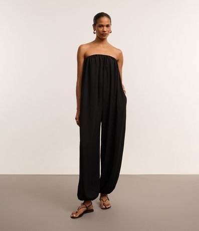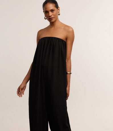Ref: Macacão sem estampa confeccionado seguindo boas práticas ambientais. A peça tomara que caia é ampla e super confortável. Conta com elástico no decote e bolsos embutidos laterais.