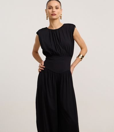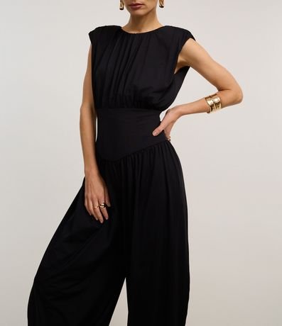 Macacão feminino confeccionado em poliamida através de boas práticas ambientais, no modelo aladim. Possui gola redonda, sem mangas, com ombreiras, cintura marcada, abertura nas laterais e sem estampa.
