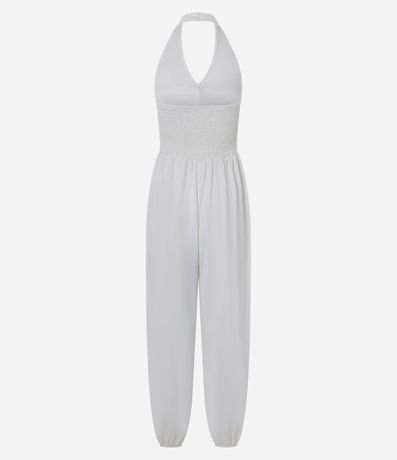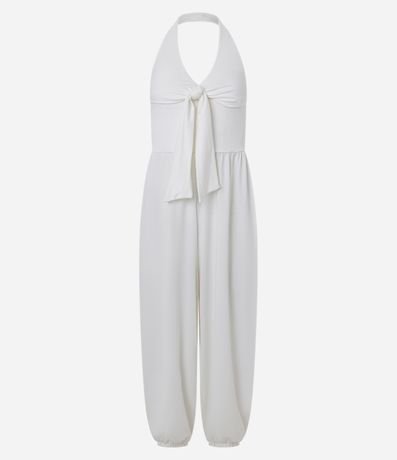 Macacão longo confeccionado em piquet, com decote v e detalhe de nó no busto que valoriza a silhueta. Modelagem aladim com pernas soltas e barra ajustada, garantindo conforto e elegância. Ideal para compor looks sofisticados e versáteis.