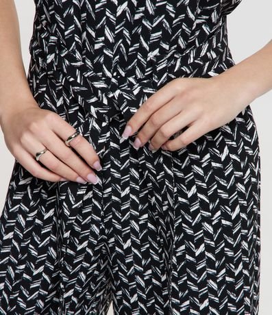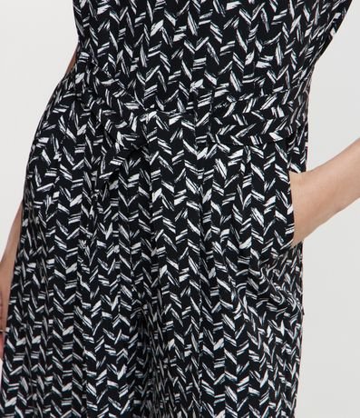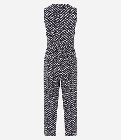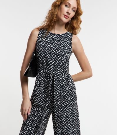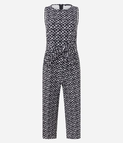 Macacão alfaiatado feminino, com amarração na cintura, sem mangas e com estampa abstrata.
