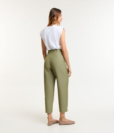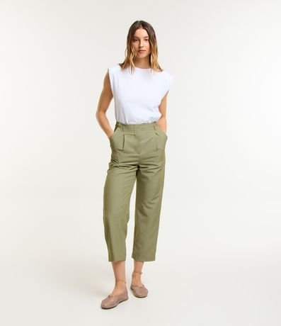 Macacão afaiatado, modelo "blusa e calça", sem mangas, gola redonda, passantes na cintura, com pregas e bolsos. A peça conta com fechamento nas costas em zíper.