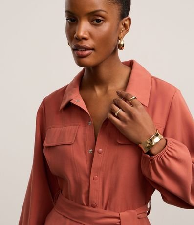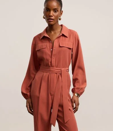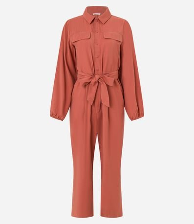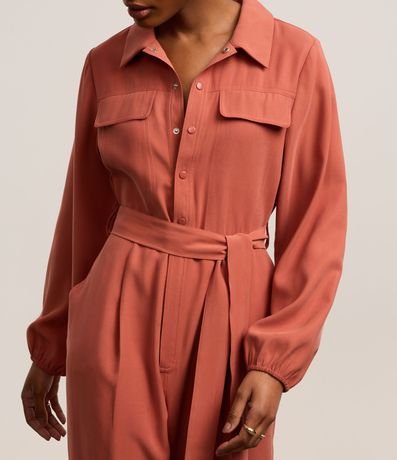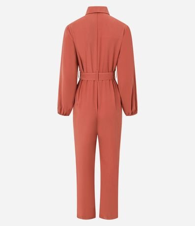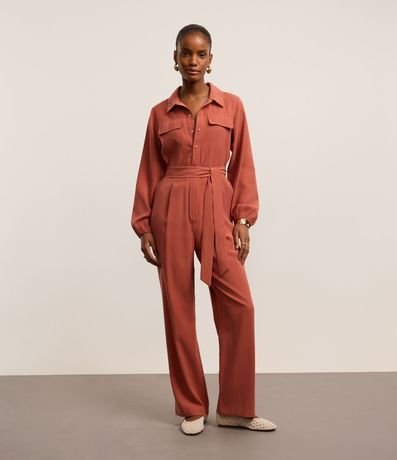 Macacão alfaiatado de mangas longas com elásticos nos punhos, confeccionado em viscolinho, com colarinho na gola e botões frontais para fechamento. Inclui cinto de tecido para amarração na cintura. Este produto possui viscose certificada em sua composição, sendo ambientalmente mais responsável.