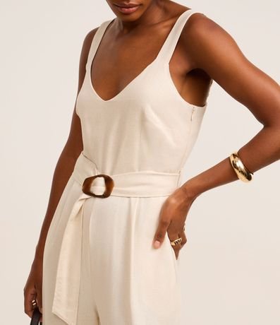 Macacão cenoura, sem mangas, confeccionado em viscolinho com 30% de linho, com decote V e alças médias. Peça possui cinto amarração com fivela com formato irregular, conferindo um efeito orgânico. Este produto possui viscose certiciada em sua composição, além de ter sido produzido através de processos mais sustentáveis com boas práticas ambientais, sendo ambientalmente mais responsável.