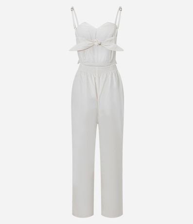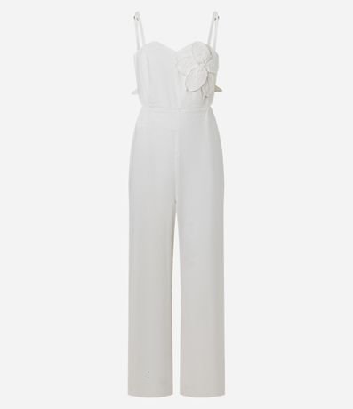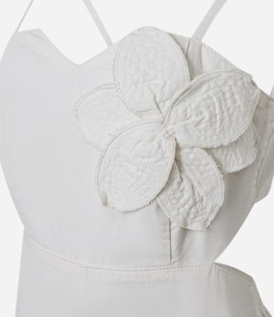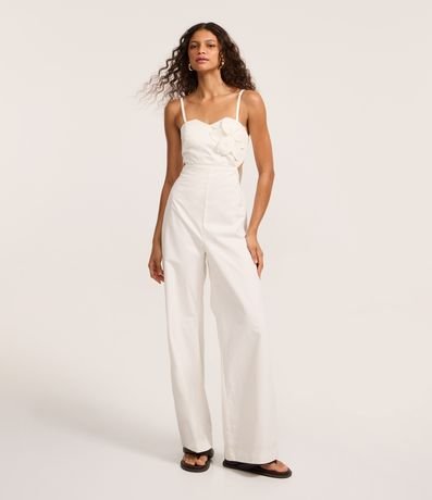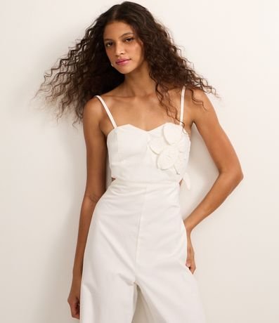 Ref: Macacão sem mangas, confeccionada em sarja, com decote coração, alcinhas finas reguláveis e flor de tecido aplicada no busto. Possui elástico atrás do cós. Este produto possui Algodão Agroecológico Instituto Lojas Renner em sua composição, sendo ambientalmente mais responsável.