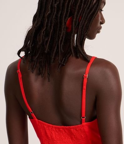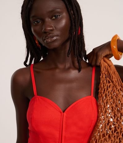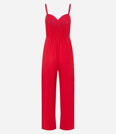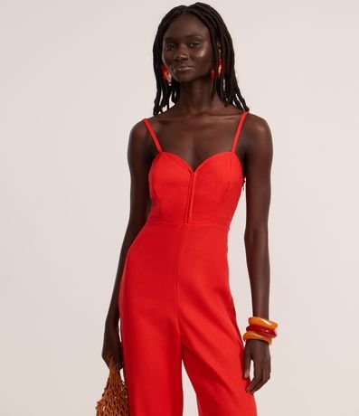 Ref: Macacão reto de alças finas reguláveis, confeccionado em viscolinho, com decote coração e lastex nas costas. Este produto possui material mais sustentável em sua composição, sendo ambientalmente mais responsável.