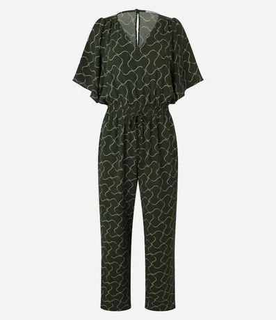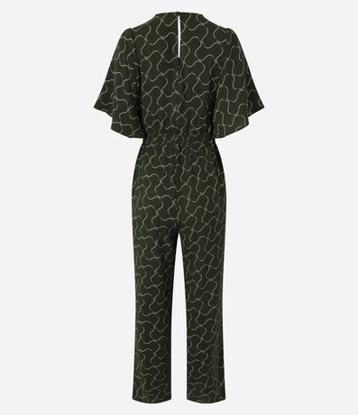 Ref: Macacão de mangas curtas godês, com gola V com fechamento por gota nas costas. Peça tem elástico e amarração na cintura, além de estamparia geométrica com linhas curvas. Tecido com efeito airflow, que é um tipo de textura que confere um aspecto amassadinho e sofisticado à peça. Roupa fabricada através de boas práticas ambientais.