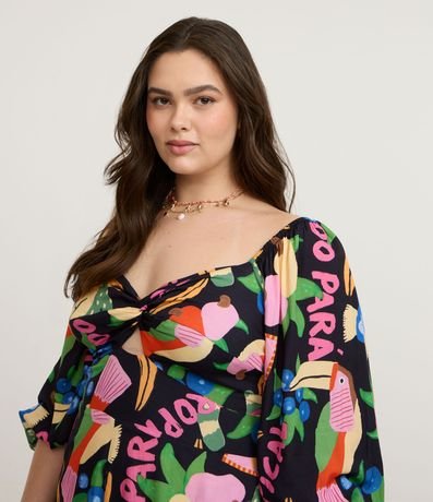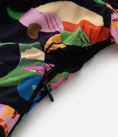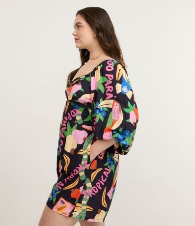 Ref: Macacão feminino confeccionado em chalis mais sustentável, no modelo curto. Possui decote v, com amarração, manga bufante, comprimento 3/4, lástex nas costas e estampa tropical.