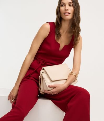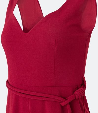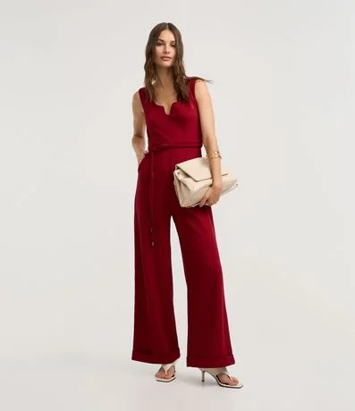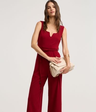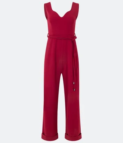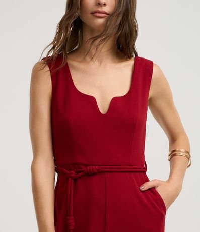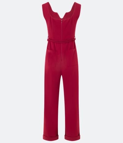 Ref: Macacão sem mangas, confeccionado em crepe, com decote V coração, recorte no busto, passantes na cintura, fechamento por zíper e bolsos nas costas. Inclui cinto corda para amarração.