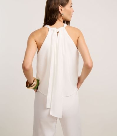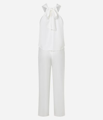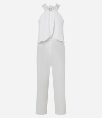 Ref: Macacão reto, sem mangas, confeccionado em crepe, com gola halter e sobreposição franzida no tronco. Peça com amarração robusta atrás do pescoço.