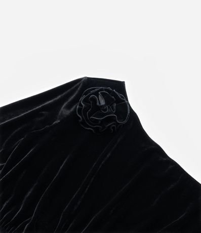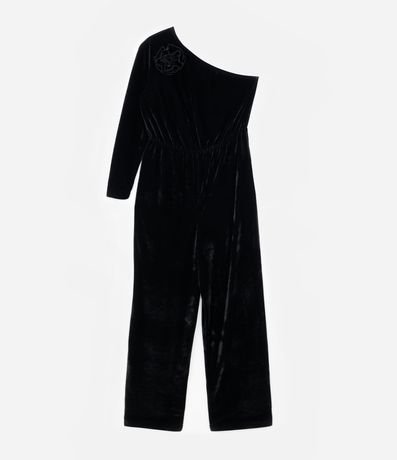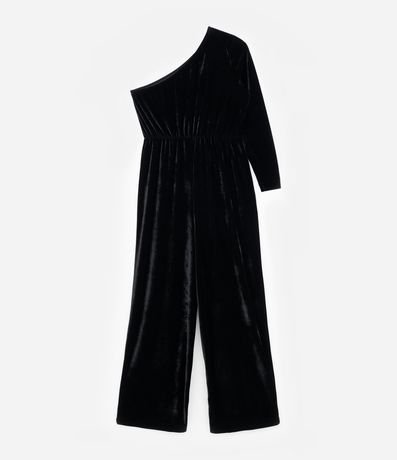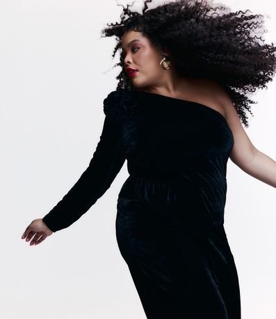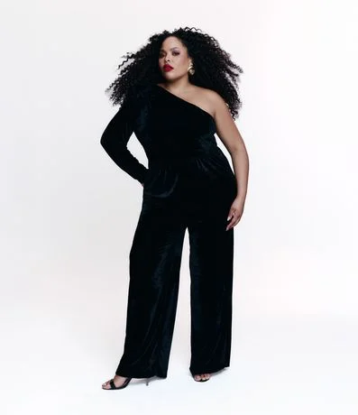 Ref: Macacão feminino Curve & Plus Size confeccionado em veludo com boas práticas ambientais, peça com ombro único, detalhe lateral. Peça em colaboração com a modelo Rita Carreira.