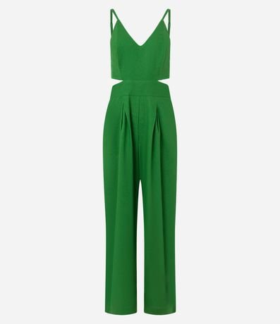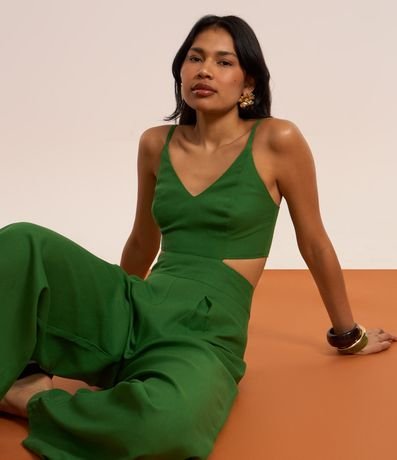 Macacão feminino confeccionado em viscose certificada e linho, peça com decote em v, alça fina ajustável, recortes laterais, calça pantalona e pregas.
