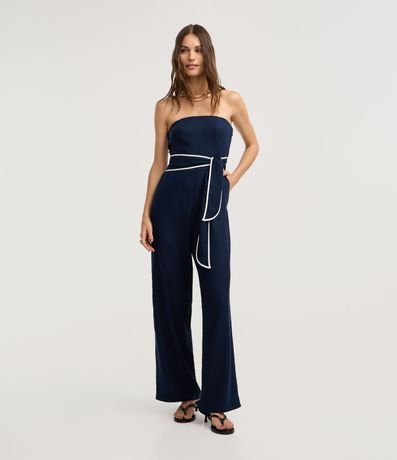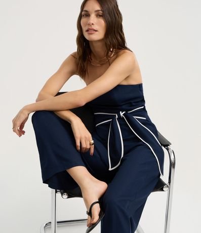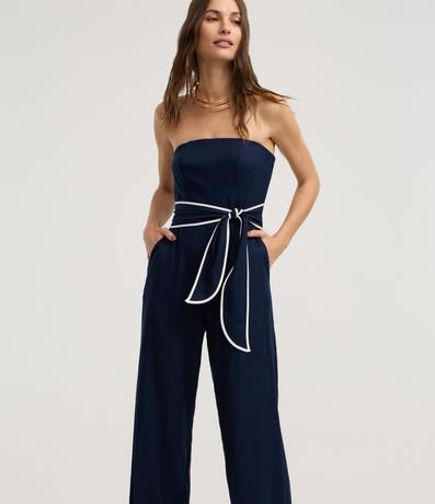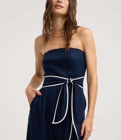 Ref: Macacão sem alças, confeccionado em viscolinho com 30% de linho, com cinto faixa para amarração na cintura. Faixa com viés contrastante. Este produto possui material mais sustentável em sua composição, sendo ambientalmente mais responsável.